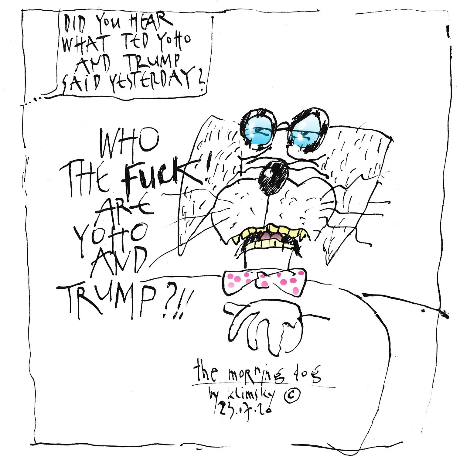 Wybór prac powstałych w ostatnim czasie. Pojęcie “ostatni czas” jest bardzo szerokie. Wielu tematów dostarczają polskie środki masowego przekazu, będące w ostatnich latach kopalnią pomysłów, opisujące wyczynach aktualnie rządzących polityków. (Pisane w maju 2023). Tu odsyłam do Instagramu: #themorningdog